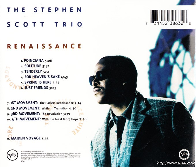 JAZZCD名称:Renaissance 艺术家名称:The Stephen Scott Trio发行公司:VERVE发行编号:314 523 863-2发行日期:1995年