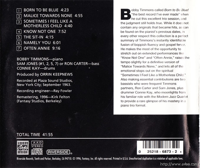 JAZZCD名称:Born To Be Blue 艺术家名称:Bobby Timmons Trio发行公司:RIVERSIDE发行编号:OJCCD-873-2发行日期:1996年