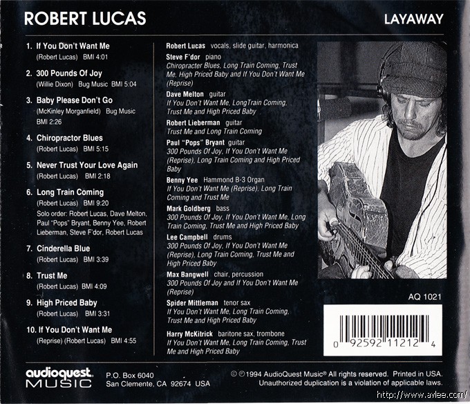 JAZZCD名称:Layaway 艺术家名称:Robert Lucas 发行公司:AudioQuest 发行编号:AQ-CD1021 发行日期:1994年 唱片美图: