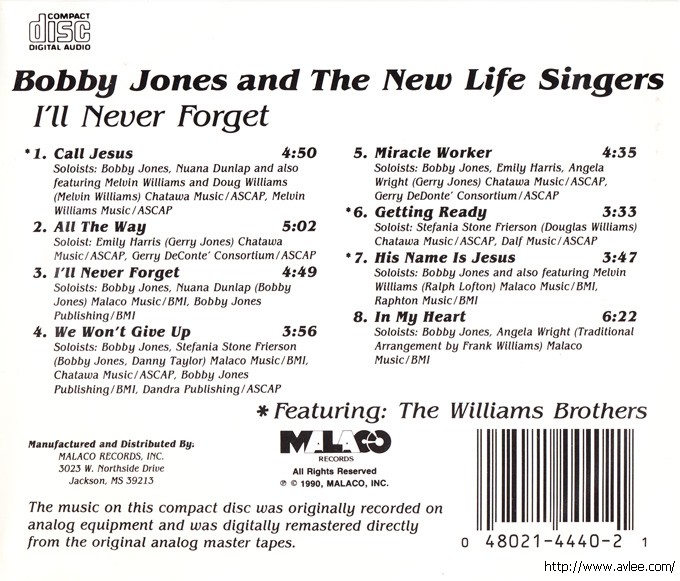 JAZZCD名称:I'll Never Forget 艺术家名称:Bobby Jones & The New Life 发行公司:MALACO RECORDS发行编号:MAL 4440 CD发行日期:1990年