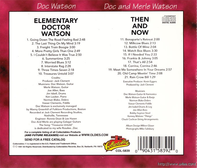 JAZZCD名称: Elementary Doctor Watson & Then and Now 艺术家名称:Doc & Merle Watson发行公司:COLLECTABLES RECORDS发行编号:COL-5839发行日期:1997年