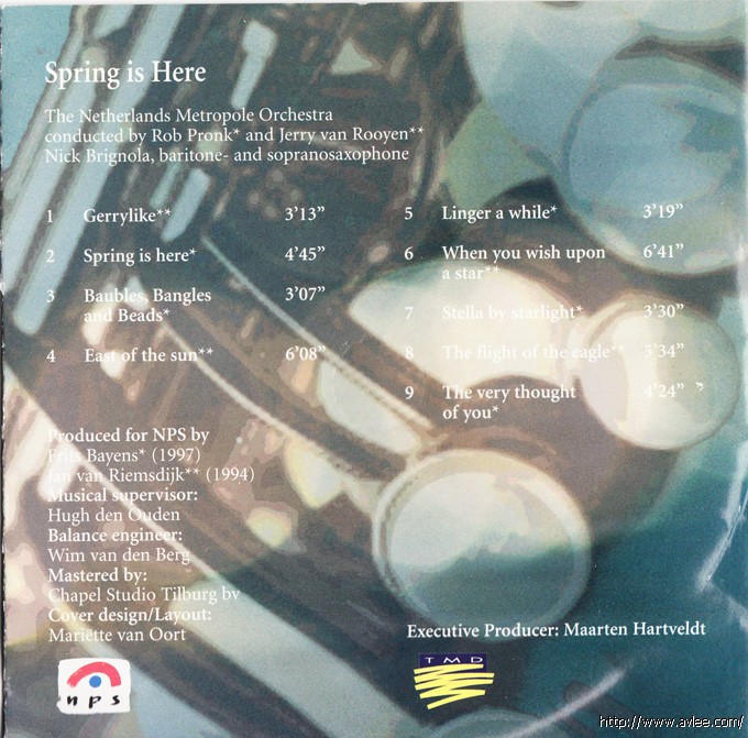 JAZZCD名称:Spring is Here艺术家名称:The Netherlands Metropole Orchestra, Nick Brignola发行公司:KOCH JAZZ发行编号:3-6905-2发行日期:1998年
