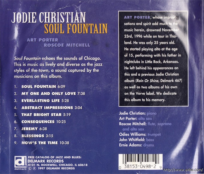 JAZZCD名称:Soul Fountain 艺术家名称:Jodie Christian 发行公司:DELMARK RECORDS发行编号:DE-498发行日期:1997年