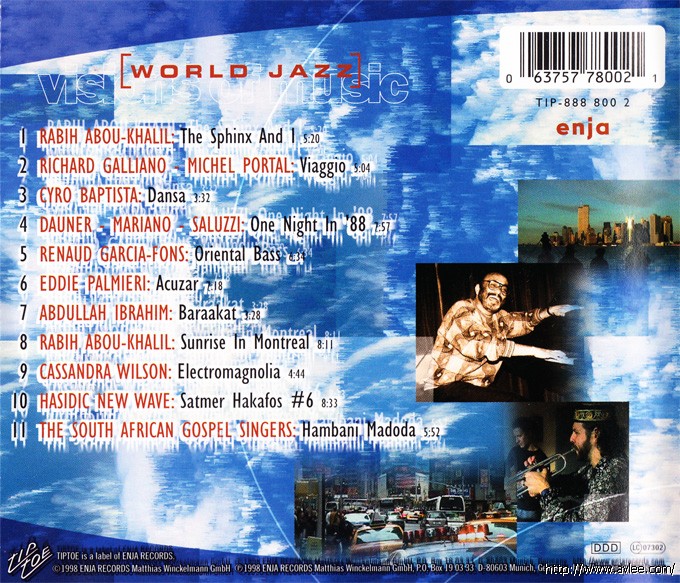 JAZZCD名称:Visions of Music - World Jazz 艺术家名称:Various Artists 发行公司:ENJA发行编号:TIP-888 800 2发行日期:1998年