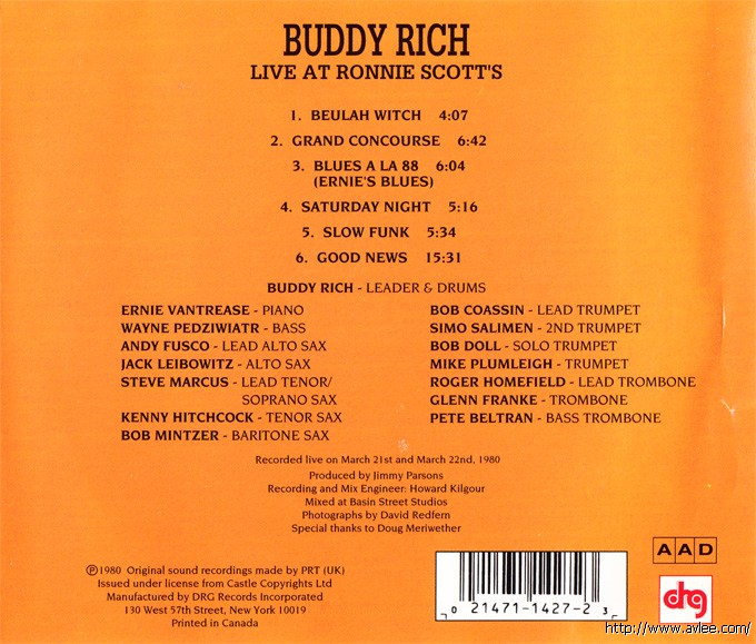 JAZZCD名称:Live At Ronnie Scott's 艺术家名称:Buddy Rich 发行公司:DRG发行编号:91427发行日期:1980年