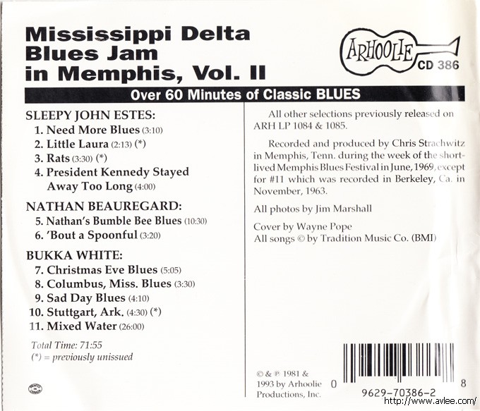 JAZZCD名称:Mississippi Delta Blues Jam in Memphis, Vol.2艺术家名称:Various Artists发行公司:ARHOOLIE发行编号:CD 386发行日期:1981年