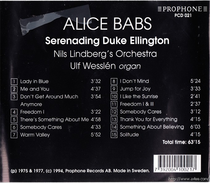 JAZZCD名称:Serenading Duke Ellington艺术家名称:Alice Babs 发行公司:PROPHONE发行编号:PCD 021发行日期:1994年