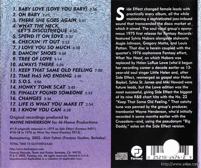 JAZZCD名称:Side Effect/What You Need 艺术家名称:Side Effect发行公司:FANTASY发行编号:FCD 24774-2发行日期:2002年