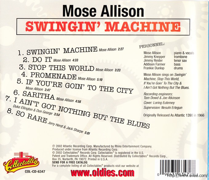 JAZZCD名称:Swingin' Machine 艺术家名称:Mose Allison 发行公司:COLLECTABLES发行编号:COL-CD-6347发行日期:2002年