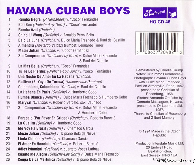 JAZZCD名称:Havana Cuban Boys 艺术家名称:Havana Cuban Boys 发行公司:HARLEQUIN发行编号:HQ CD 48发行日期:1994年