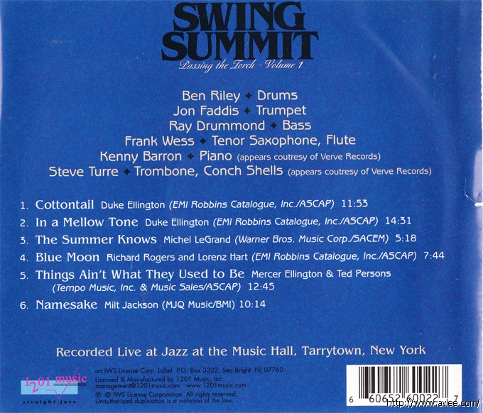 JAZZCD名称:Swing Summit: Passing the Torch, Vol. 1艺术家名称:Swing Summit发行公司:STRAIGHT JAZZ发行编号:6002-2发行日期:1997年