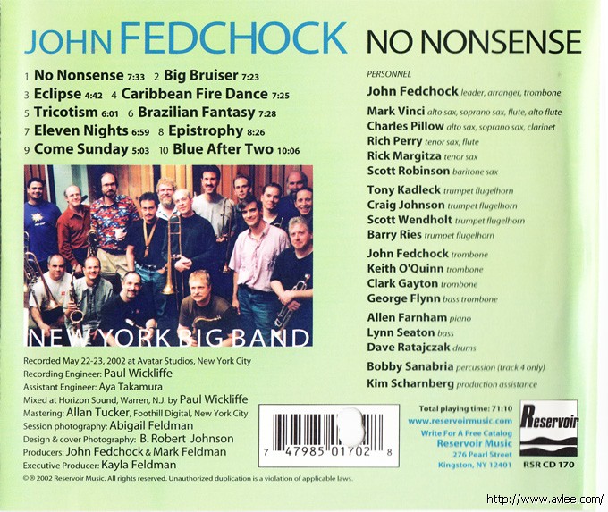 JAZZCD名称:No Nonsense 艺术家名称:John Fedchock发行公司:RESERVOIR发行编号:RSR CD 170发行日期:2002年
