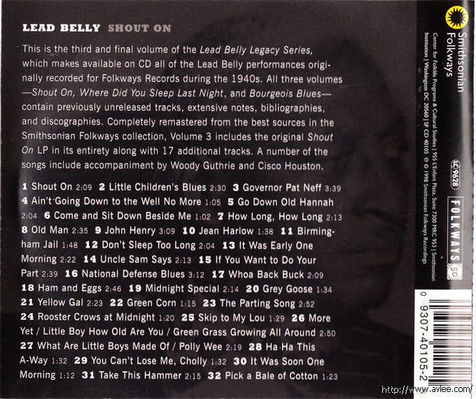 JAZZCD名称:Shout On艺术家名称:Lead Belly 发行公司:SMITHSONIAN FOLKWAYS发行编号:SF CD 40105发行日期:1998年