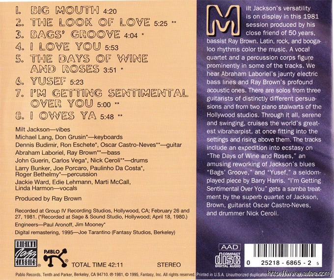 JAZZCD名称:Big Mouth 艺术家名称:Milt Jackson 发行公司:PABLO发行编号:OJCCD-856-2发行日期:1995年
