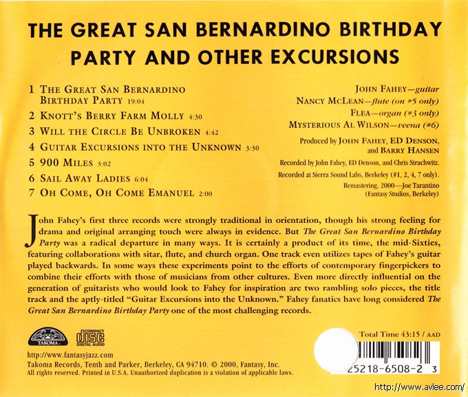 JAZZCD名称:Vol. 4: The Great San Bernardino Birthday Party 艺术家名称:John Fahey 发行公司:TAKOMA发行编号:TAKCD-6508-2发行日期:2000年