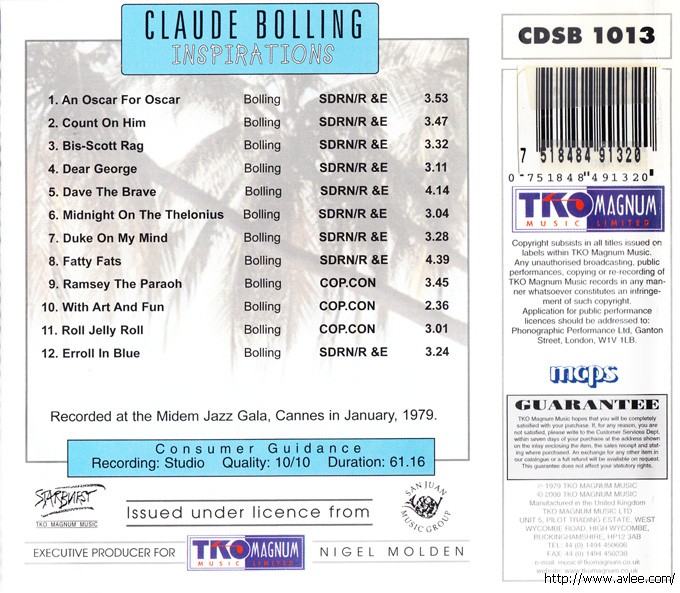 JAZZCD名称:Inspirations艺术家名称:Claude Bolling 发行公司:TKO MAGNUM MUSIC发行编号:CDSB 1013发行日期:2000年