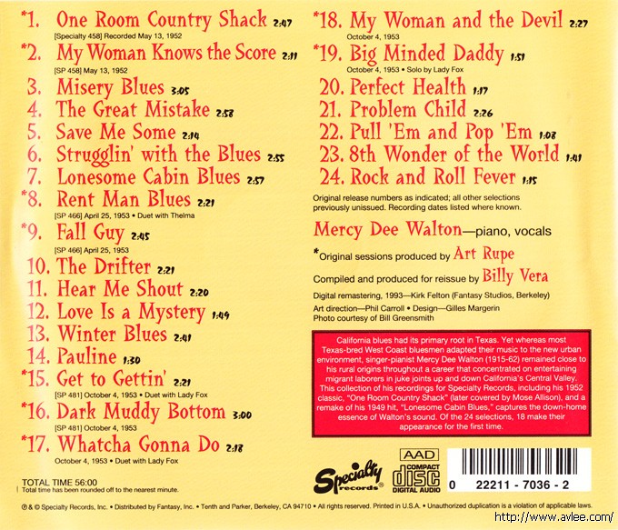 JAZZCD名称:One Room Country Shack 艺术家名称:Mercy Dee Walton发行公司:SPECIALTY发行编号:SPCD-7036-2发行日期:1993年