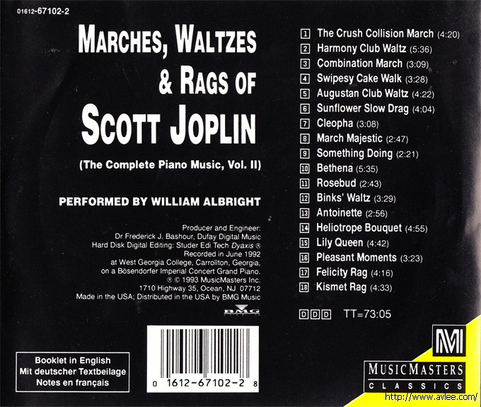 JAZZCD名称:Marches, Waltzes & Rags of Scott Joplin艺术家名称:William Albright 发行公司:Musicmasters发行编号:01612-67102-2发行日期:1993年