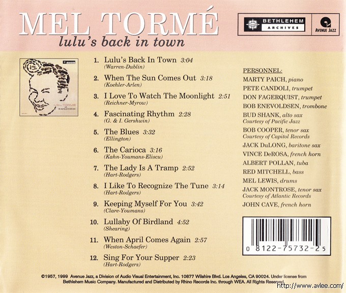 JAZZCD名称:Lulu's Back in Town艺术家名称:Mel Tormé 发行公司:AVENUE JAZZ发行编号:R2 75732发行日期:1999年