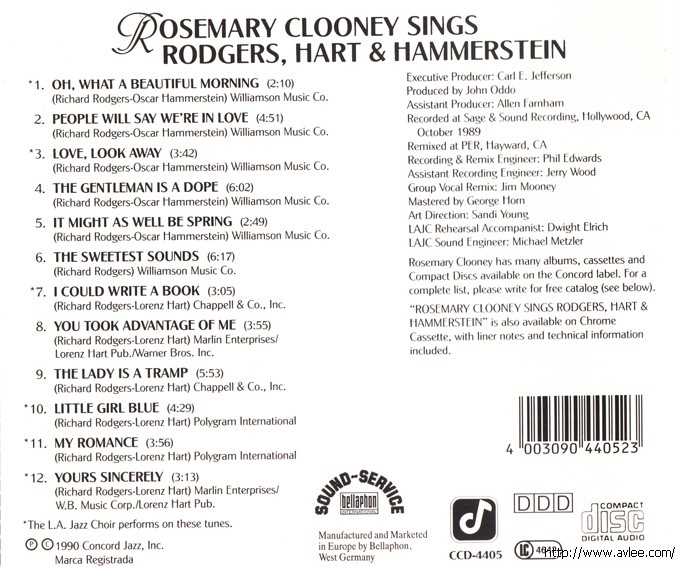 JAZZCD名称:Sings Rodgers Hart & Hammerstein 艺术家名称:Rosemary Clooney 发行公司:CONCORD发行编号:CCD-4405发行日期:1990年