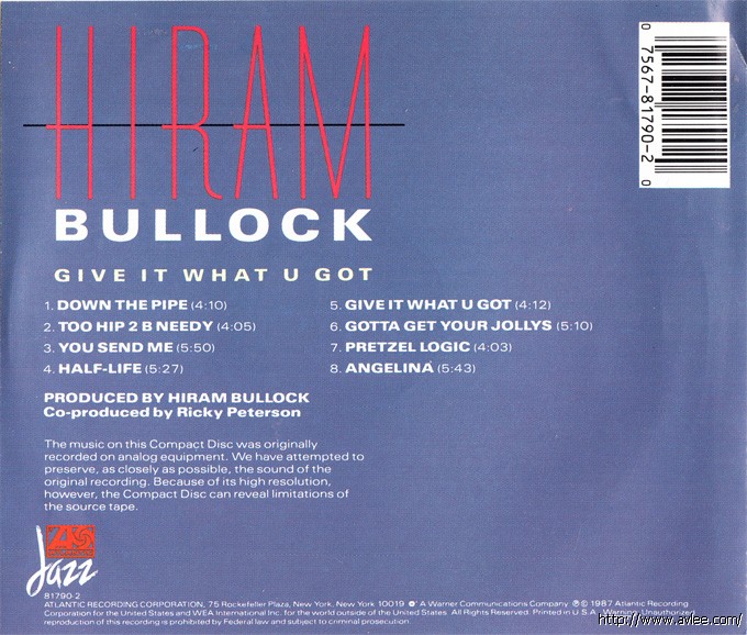JAZZCD名称:Give It What U Got 艺术家名称:Hiram Bullock 发行公司:ATLANTIC发行编号:7 81790-2发行日期:1987年