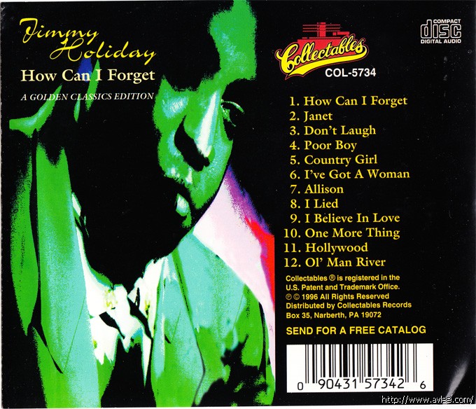 JAZZCD名称:How Can I Forget - A Golden Classics Edition 艺术家名称:Jimmy Holiday 发行公司:COLLECTALLES 发行编号:COL-5734 发行日期:1996年 唱片美图: