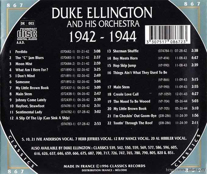 JAZZCD名称:Duke Ellington - 1942-1944 艺术家名称:Duke Ellington & His Orchestra发行公司:CLASSICS发行编号:CLASSICS 867发行日期:1996年