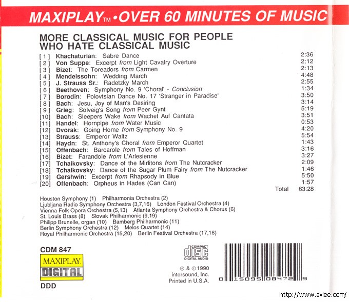 JAZZCD名称:More Classical Music for People Who Hate Classical Music 艺术家名称:More Classical Music发行公司:Pro-Arte Records发行编号:CDM 847发行日期:1990年