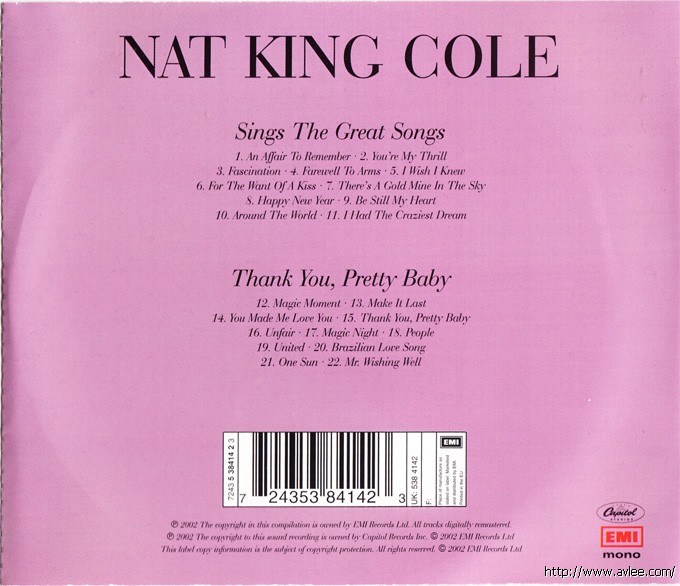 JAZZCD名称:Sings the Great Songs / Thank You, Pretty Baby 艺术家名称:Nat King Cole发行公司:EMI发行编号:7243-538414 23发行日期:2002年
