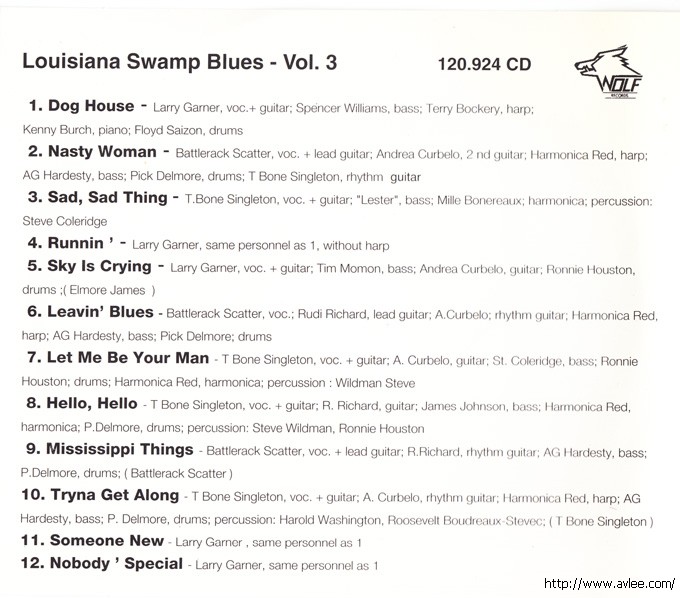 JAZZCD名称:Louisiana Swamp Blues Vol. 3 艺术家名称:Various Artists发行公司:WOLF发行编号:120.924 CD发行日期:1990年