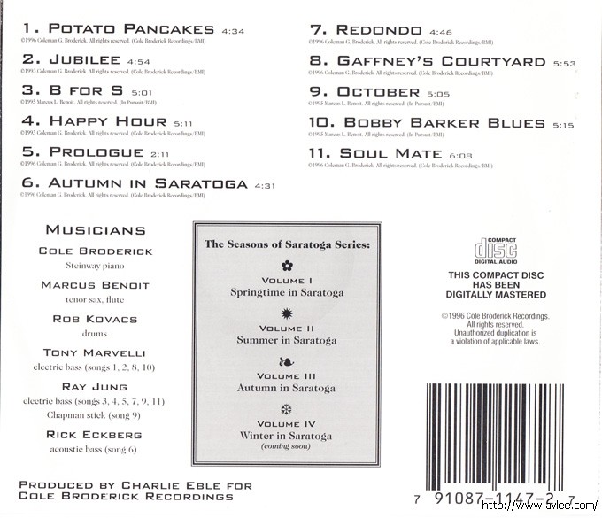 JAZZCD名称:Autumn In Saratoga Volume 3 艺术家名称:Cole Broderick Quartet发行公司:COLE BRODERICK 发行编号:CBR 9303发行日期:1996年