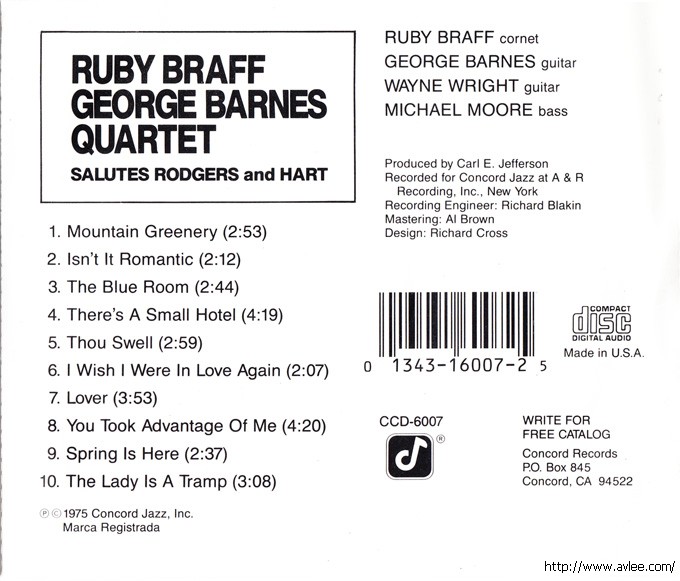 JAZZCD名称:Salutes Rodgers & Hart 艺术家名称:Ruby Braff / George Barnes Quartet 发行公司:CONCORD JAZZ发行编号:CCD-6007发行日期:1975年