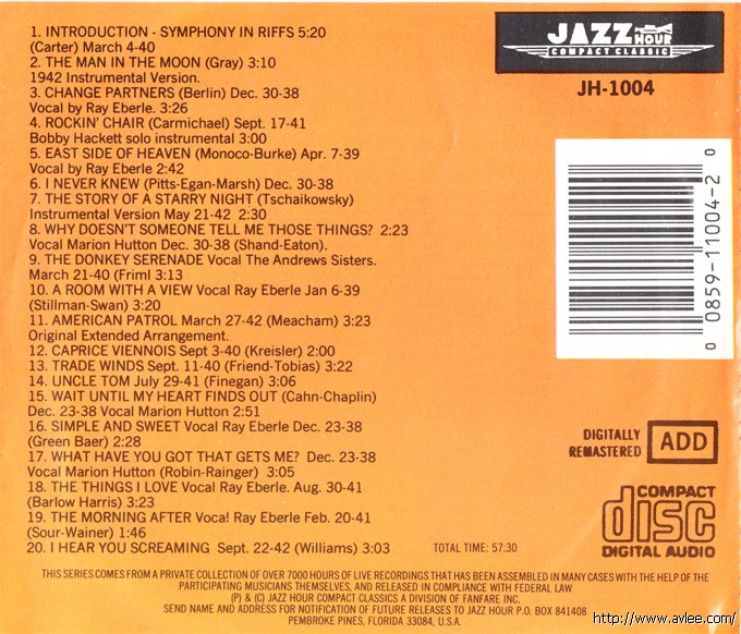 JAZZCD名称:1938-42 Broadcast Versions They Never Recorded艺术家名称: Glenn Miller & His Orchestra发行公司:JAZZ HOUR发行编号:JH-1004发行日期:1990年