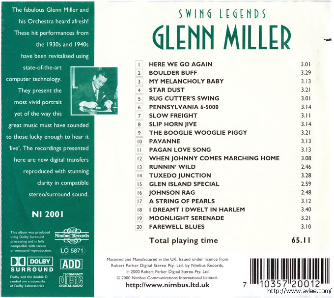 JAZZCD名称:Swing Legends: 20 Classic Hits艺术家名称:Glenn Miller发行公司:NIMBUS发行编号:NI 2001发行日期:2000年