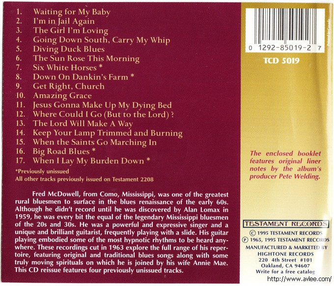 JAZZCD名称: My Home Is In The Delta 艺术家名称:Fred & Annie Mae McDowell / Mississippi Fred Mcdowell 发行公司:TESTAMENT发行编号:TCD 5019发行日期:1995年
