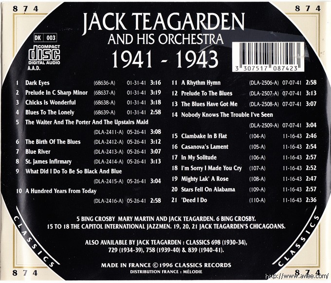 JAZZCD名称:Jack Teagarden 1941-1943 艺术家名称:Jack Teagarden 发行公司:CLASSICS发行编号:874发行日期:1996年