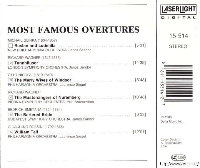 JAZZCD名称:Most Famous Overtures艺术家名称:Various Artists发行公司:DIGITAL STEREO发行编号:15 514发行日期:1998年