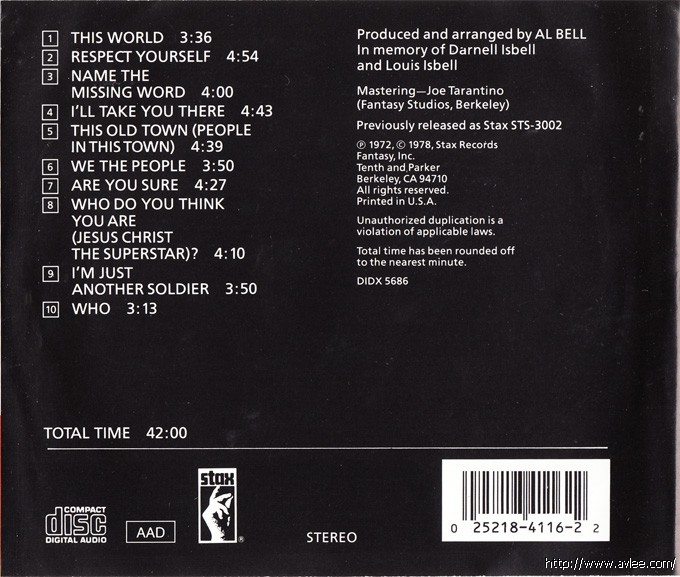 JAZZCD名称:Be Altitude: Respect Yourself 艺术家名称:The Staple Singers 发行公司:STAX发行编号:SCD-4116-2发行日期:1978年