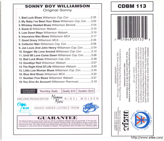 JAZZCD名称: Original Sonny 艺术家名称:SONNY BOY WILLIAMSOM发行公司:BLUE MOON发行编号:CDBM 113发行日期:1997年