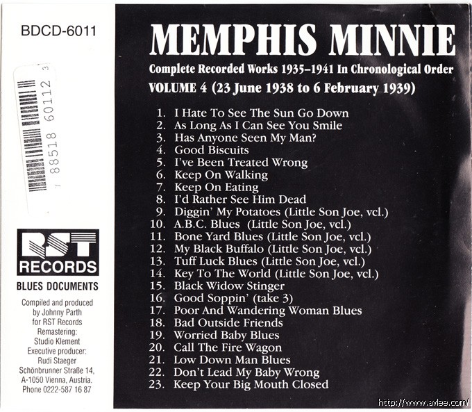 JAZZCD名称:Memphis Minnie Vol 4 1938 - 1939艺术家名称:Memphis Minnie发行公司:RST发行编号:BDCD-6011发行日期:1991年