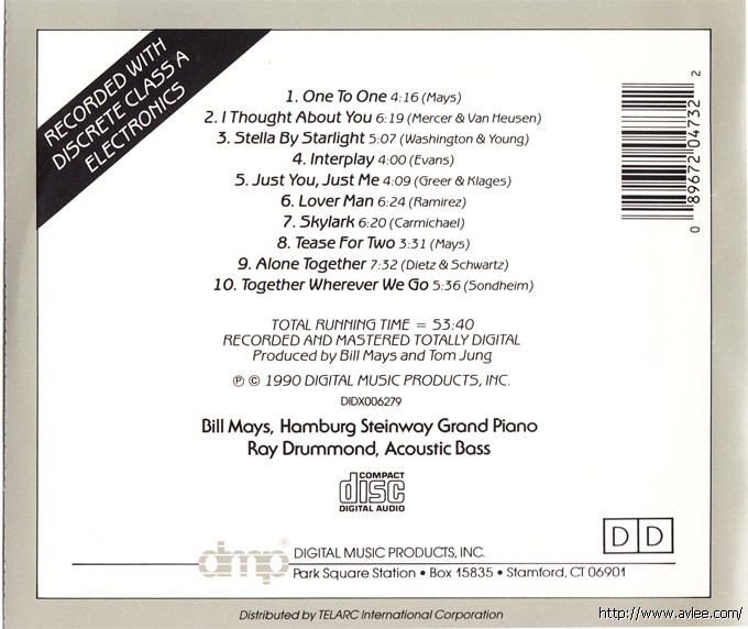 JAZZCD名称:One to One 艺术家名称:Ray Drummond, Mays/Drummond发行公司:DIMP发行编号:CD-473发行日期:1990年
