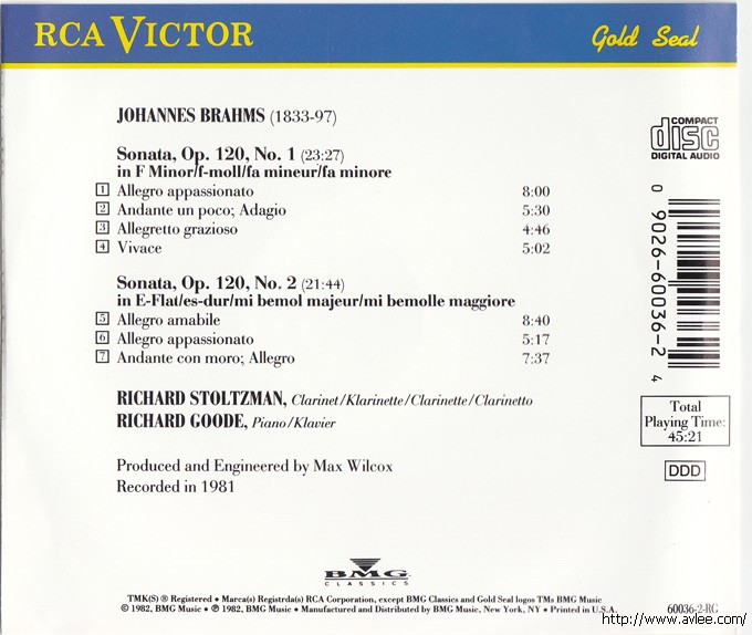 JAZZCD名称:Brahms: Sonatas for Clarinet & Piano, Op.120 艺术家名称:Johannes Brahms发行公司:BMG发行编号:60036-2-RC发行日期:1982年