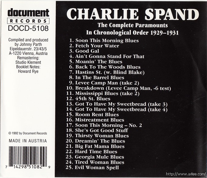 JAZZCD名称:The Complete Paramounts (1929-1931)艺术家名称:Charlie Spand 发行公司:DOCUMENT发行编号:DOCD-5108发行日期:1992年