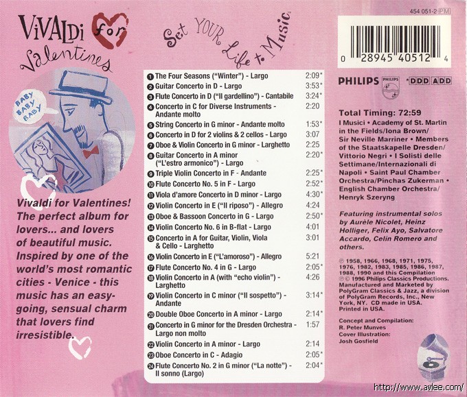 JAZZCD名称:Vivaldi for Valentines: Romantic Interludes for the One You Love 艺术家名称:Various Artists发行公司:PHILIPS发行编号:454-051-2发行日期:1996年
