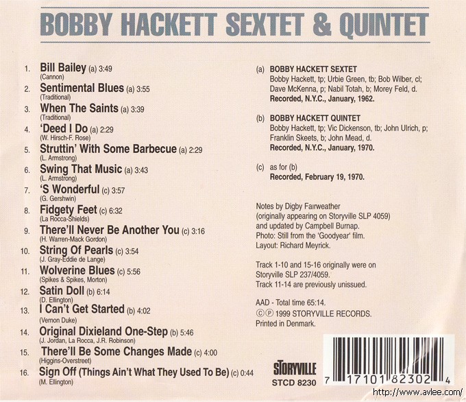 JAZZCD名称: Sextet & Quintet 艺术家名称:Bobby Hackett 发行公司:STOYVILLE发行编号:STCD 8230发行日期:1999年