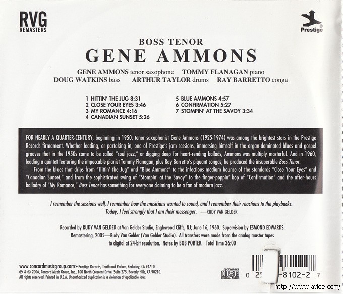 JAZZCD名称: Boss Tenor 艺术家名称:Gene Ammons 发行公司:PRESTIGE发行编号:PRCD-8102-2发行日期:2006年