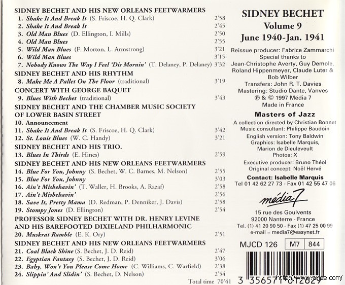 JAZZCD名称:Sidney Bechet Vol. 9: 1940-1941艺术家名称:Sidney Bechet发行公司:Masters of Jazz发行编号:MJCD 126发行日期:1998年
