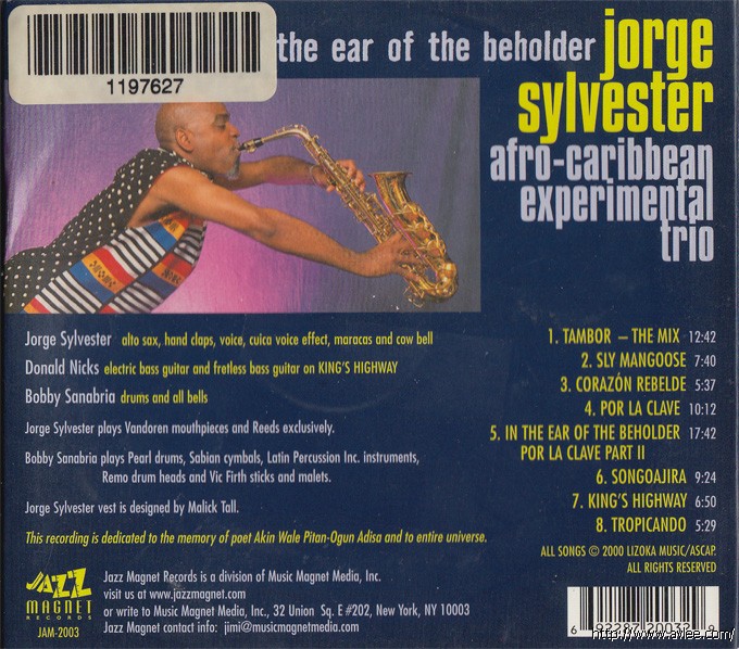 JAZZCD名称:In the Ear of the Beholder 艺术家名称:Jorge Sylvester 发行公司:ALL DONHD 发行编号:JAM-2003 发行日期:2000年 唱片美图: