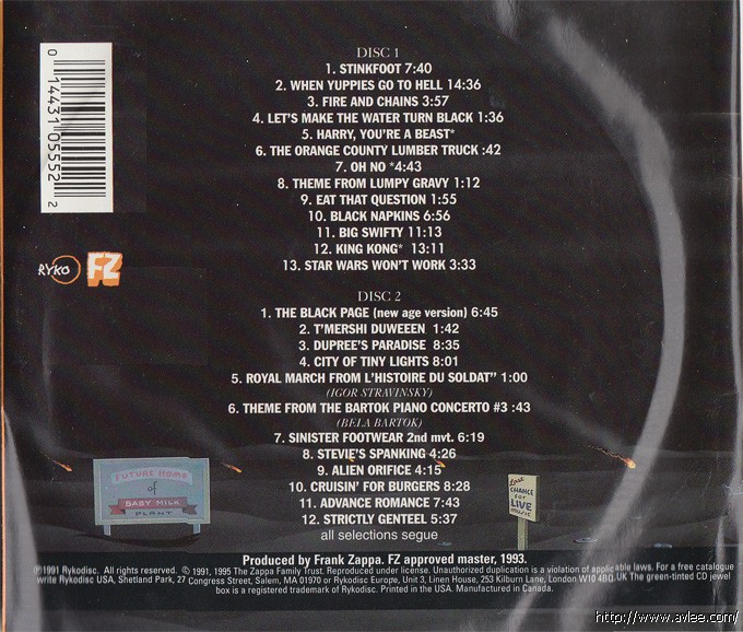 JAZZCD名称:Make a Jazz Noise Here 艺术家名称:Frank Zappa发行公司:RYKODISC发行编号:RCD 10555/56发行日期:1995年