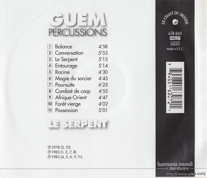 JAZZCD名称:Percussions 艺术家名称:Guem Et Zaka Percussion 发行公司:LE CHANT DU MONDE发行编号:674845发行日期:1985年